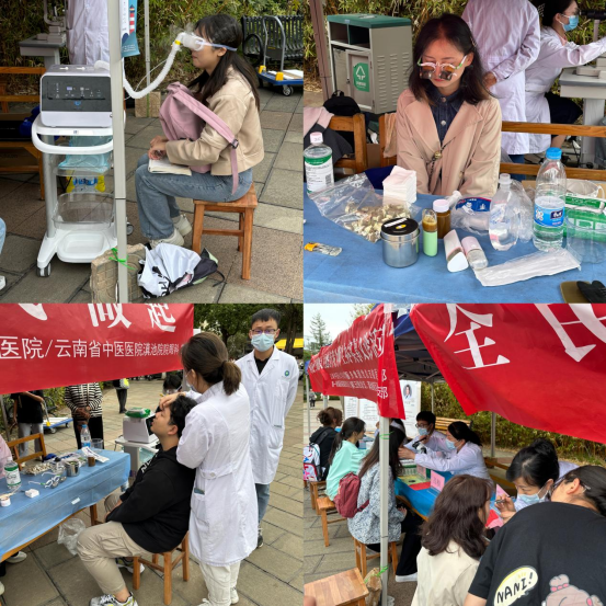 本次义诊活动由附一院滇池院区眼科夏泽梅主任医师带队到呈贡校区为学校师生开展眼科义诊、眼科体检、眼健康咨询、眼科中医特色治疗等服务。活动开始,医护人员向师生普及了白内障、屈光不正等眼科疾病的相关知识,解答大家关于眼部日常保健的咨询,引导大家关注视力健康,做到眼科疾病早发现早治疗。随后,医护人员用专业仪器设备为师生进行视力测试、白内障、眼底疾病、眼部干涩不适等各种眼科疾病检查,并详细询问师生眼部状况及日常生活习惯,耐心地分析病情,细心地讲解生活中如何注意眼睛健康的事项,还为有需要的师生指导下一步的诊疗方向。最后,医护人员在现场分发润目茶,为师生进行核桃灸、中药熏药、眼部刮痧、耳穴贴压等眼科特色治疗,吸引了众多师生驻足观看体验。